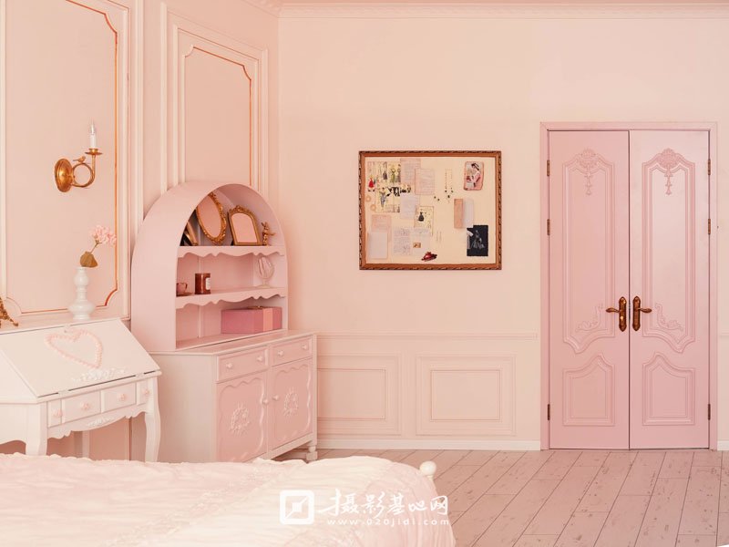 H.Home粉色卧室公主卧室公主床梳妆台吊帐